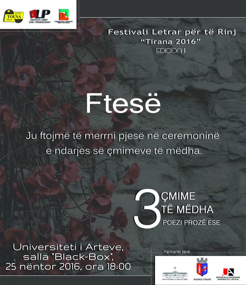 Aktivitete • Aktivitete të përditësuara • Festivali Letrar për të Rinj "Tirana 2016" - Edicioni II Ftesë – Festivali Letrar për të Rinj “Tirana 2016” Ftesë – Festivali Letrar për të Rinj “Tirana 2016”, Universiteti i Arteve, salla “Black-Box”, 25 nëntor 2016, ora 18:00.